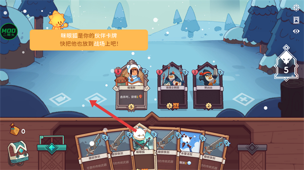 3、在手牌中找到伙伴卡片眯眼狐,按照提示将其拖拽至战场的空闲位。