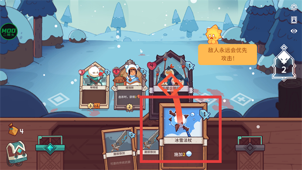 4、查看手牌中的冰雪法杖道具卡,将其拖拽至敌人身上,即可发起攻击。