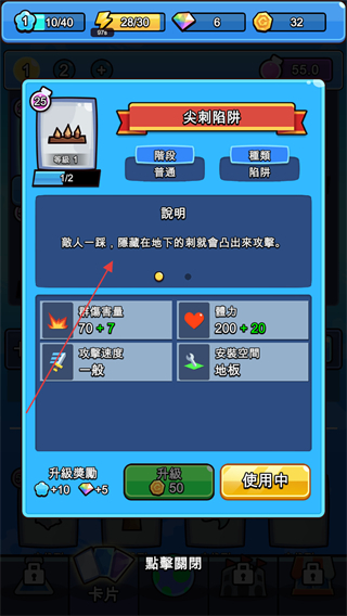 2、点击卡牌打开尖刺陷阱详情页,该陷阱由敌人踩踏触发攻击,可查看其群伤等属性,消耗资源点升级能提升能力。