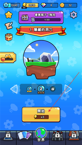 3、在世界界面选择隐藏的洞穴关卡,确认后点击消耗3闪电的开始按钮,即可进入该关卡展开挑战。