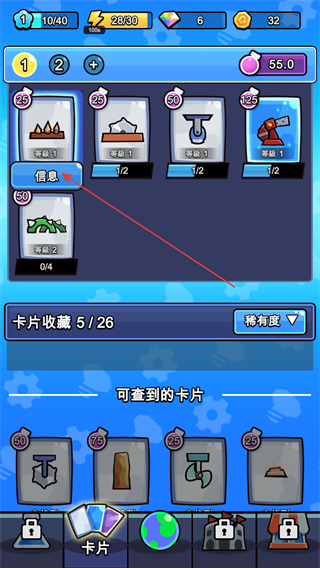 1、在卡牌界面点击信息可查看卡牌详情,这里展示不同等级的陷阱类卡牌,能了解其属性与卡片的收集进度。
