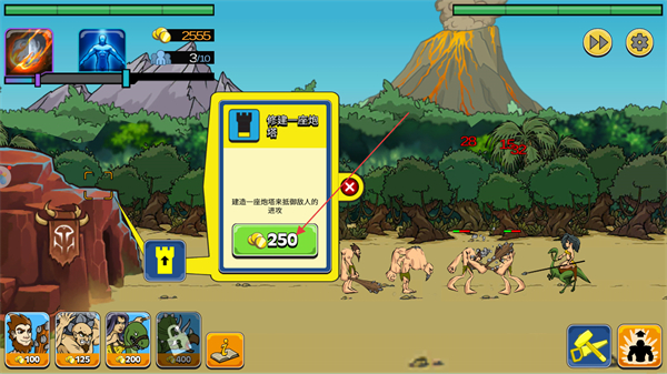 2、战斗过程中出现修建一座塔的提示,消耗250资源完成该塔修建,此塔可辅助进攻敌人,提升己方战场的攻防辅助能力。