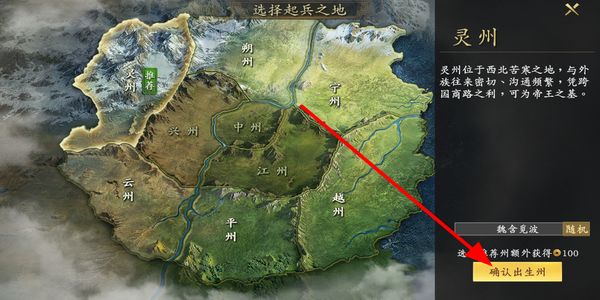 1、查看各州信息后选定起兵之地,选择对应州后点击确认出生州,部分州可额外获取资源,完成选择开启游戏。
