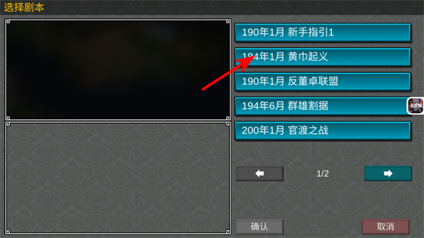 2、进入剧本选择界面后,选择对应历史剧本如184年1月黄巾起义,这是确定游戏时代背景、开局条件的核心操作,不同剧本对应不同战略环境。