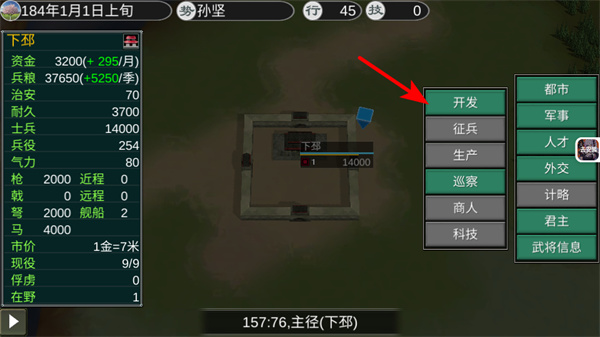 3、进入领地界面后,点击开发可进入城池建设界面,这是提升领地资源产出如兵力、钱粮的关键操作,持续开发能强化领地的经济与军事基础。