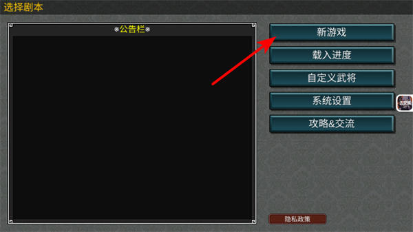 1、在游戏主界面,点击新游戏按钮可进入剧本选择环节,这是开启三国策略玩法的基础操作,后续需通过选择剧本、经营领地推进势力发展。