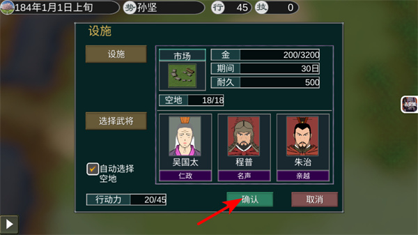 4、在设施建设界面,选择武将如吴国太负责领地开发,点击确认可完成建设指令,合理分配武将能力如仁政、能提升开发效率,加速领地成长。