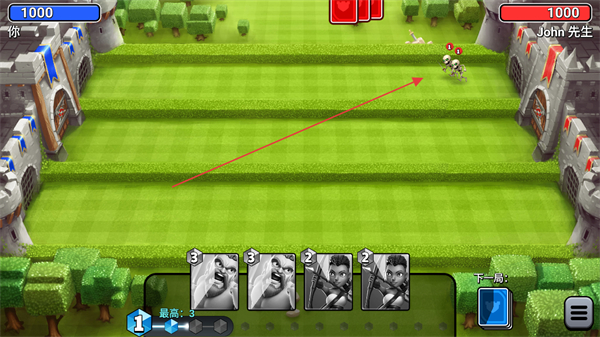 1、在对应路径放置卡牌召唤士兵,如骷髅兵,向敌方城堡推进,消耗敌方生命值。