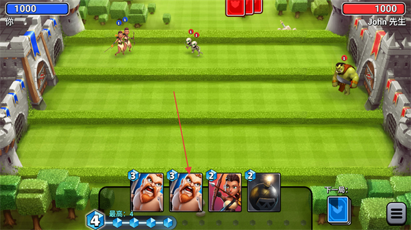 2、根据敌方出兵情况,放置合适卡牌,如野蛮人,对抗敌方单位,保护己方城堡。