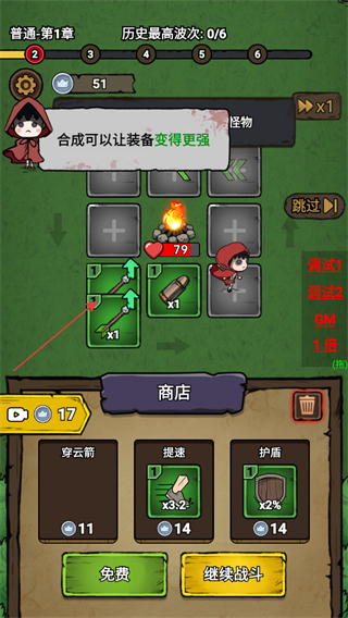 1、处于普通-第1章界面,在商店消耗11货币购买穿云箭,其可让箭矢数量x1并穿透2个怪物,购买后点击继续战斗推进波次。