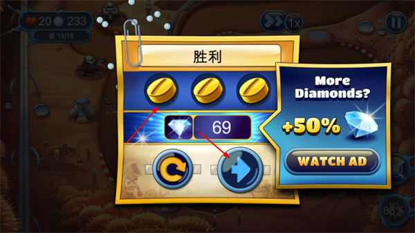 3、成功抵御所有波次敌人后,可获得金币、钻石等奖励,还可通过观看广告获取更多钻石。
