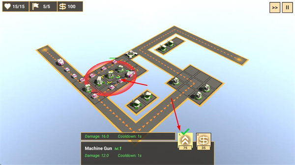 3、消耗金币升级防御塔如机枪塔升级后伤害提升,增强防御塔的攻击能力,提升清敌效率。