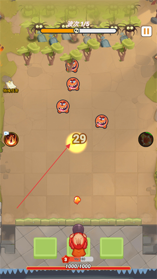 4、处于波次1/5的战斗场景,攻击敌人会显示伤害数值,需击败当前波次敌人来推进关卡进程。