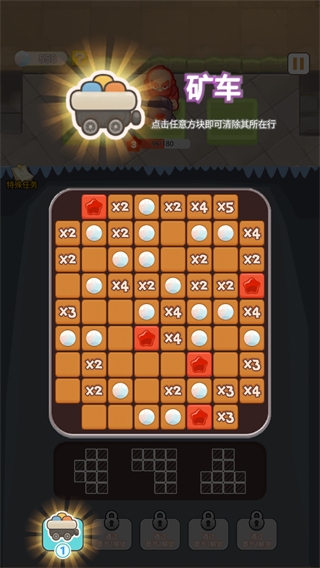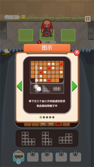 1、在当前关卡界面,拖动底部的形状方块放置带上方区域内,触发对应区域元素消除,可获得奖励以此推进关卡进度。