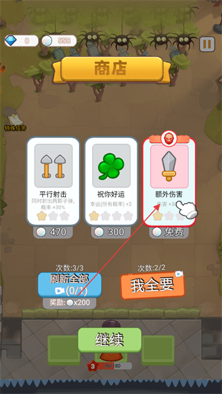 3、在商店界面点击免费的额外伤害道具,领取该道具可增加伤害+30,还能选其他道具提升战斗能力。