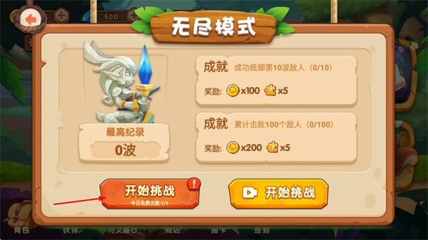 3、在无尽模式界面,点击开始挑战参与生存类关卡,达成击杀目标可获取对应奖励,挑战更高波数记录。