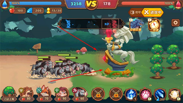 2、对战中指挥己方单位集群进攻,以数量优势压制敌方防御设施,快速积累对战积分扩大优势。