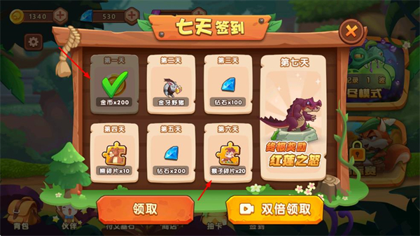 4、在七天签到界面,点击领取获取当日奖励;也可观看视频解锁双倍奖励,积累资源强化阵容。