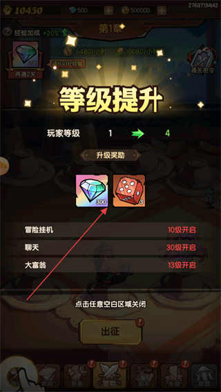 4、战斗结算后会触发等级提升,玩家等级从1提升至4,同时可领取升级奖励里的钻石和骰子,还能看到不同功能的开启等级。
