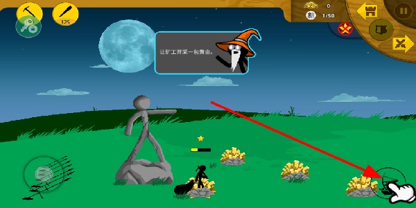 2、控制火柴人采矿,指挥矿工采集金矿,获取金币资源,为部队训练和升级提供资金支持。