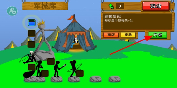 3、在军械库升级,提升雕像皇冠等建筑的属性,增加每秒金币数,增强部队的经济和战斗能力。