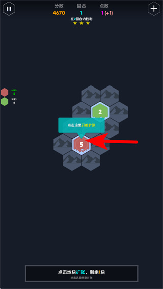 2、找到箭头标注的数字5地块,点击它执行扩张操作,这是积累己方据点的基础操作,会纳入己方控制范围并推进对局进度。