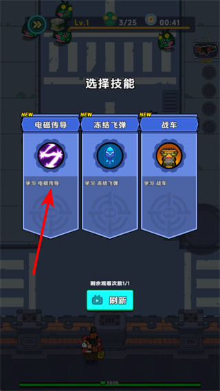 4、选择对应技能强化战力,这是提升生存能力的重要操作,选择战局的技能,获得范围攻击、增益效果等优势,更好地应对密集的僵尸波次。