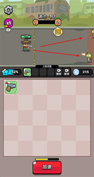1、在波次关卡中,操控角色使用武器射击僵尸,开启波次防御。
