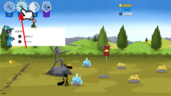 通过召唤挖矿火柴人收集矿石资源,资源充足即可召唤攻击性士兵,若挖矿效率低,可使用钻石加速,资源采集与部队召唤的平衡,是前期建立战力优势的关键。