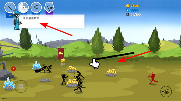 4、滑动界面指挥弓箭手,这是操控单位移动的操作,按照指引滑动可让弓箭手前往目标区域执行任务。