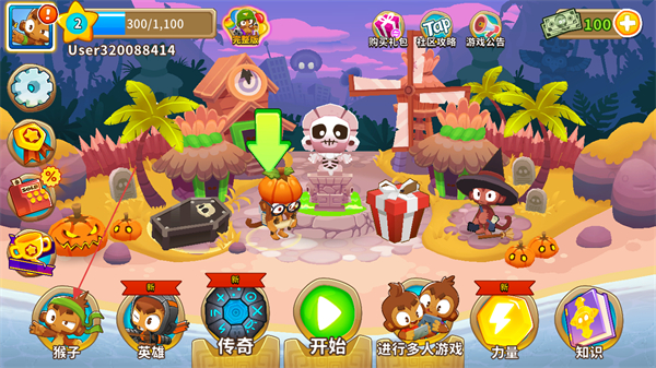 1、打开气球塔防6游戏开始界面,点击左下角的猴子按钮查看现有猴子。