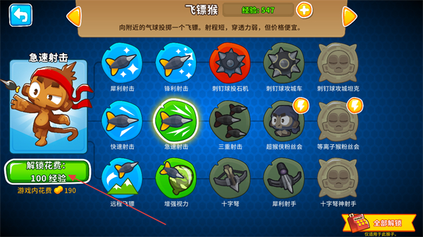 3、在猴子的信息界面中,可以点击技能表上的技能花费经验进行解锁。