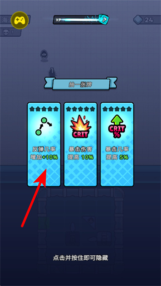 1、进入游戏的技能选择界面后,点击红色箭头指向的反射几率增加10%技能选项,解锁该增益效果,这是提升战斗能力的关键操作。
