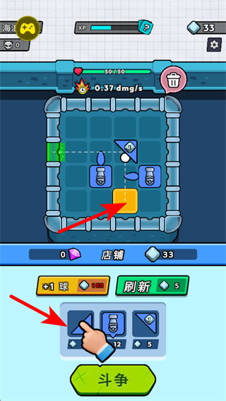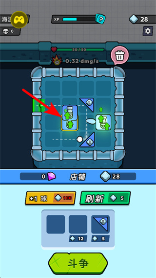 2、回到战斗界面后,点击红色箭头指向的道具选项,消耗钻石将其部署到方格内的目标位置,进一步强化战斗阵容的输出能力。