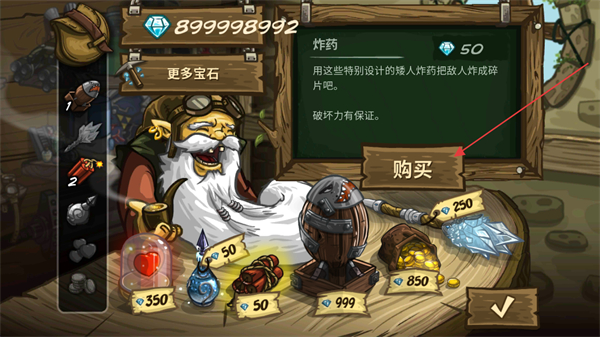 3、在商店界面里,消耗宝石点击购买可获取炸药,该道具能将敌人炸成碎片,提升战斗破坏力。