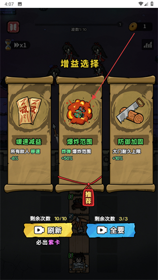 4、升级后弹出增益选择界面,可挑选如爆炸范围+50%等增益效果来强化能力,选择后即可推进至后续关卡流程。