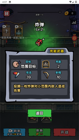 2、进入关卡准备界面后,将武器如弓箭布置到床铺对应的格子中,完成布置后点击开战按钮,即可启动当前波数的战斗。
