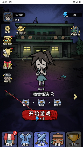 1、游戏主界面显示第一章宿舍怪谈,左侧有设置、签到等功能按钮,点击底部消耗5个闪电的开始游戏按钮,即可进入该章节的关卡流程。