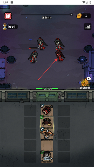 3、战斗界面中,布置的武器会自动攻击出现的敌人,界面显示当前波数与资源获取情况,击败敌人可推进波数进度。