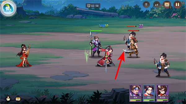 3、紧跟红色箭头指引,操控上阵的武将向敌方单位发起攻击,推进关卡战斗进度。