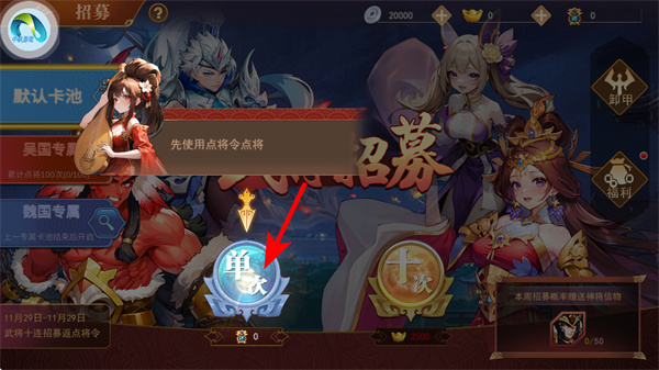 1、点击招募界面中的单次按钮,消耗点将令进行武将招募,获取新的武将单位。