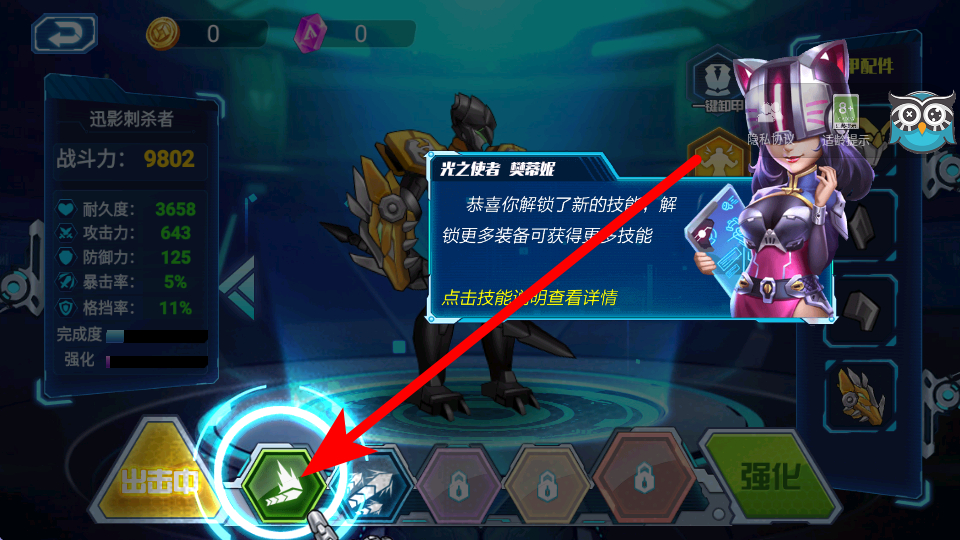 2、在改装升级场所,可点击装甲配件进行装备,装备后机甲的各项属性会得到提升,比如迅影刺杀者装备配件后,耐久度、攻击力等会增加,让机甲更强大。