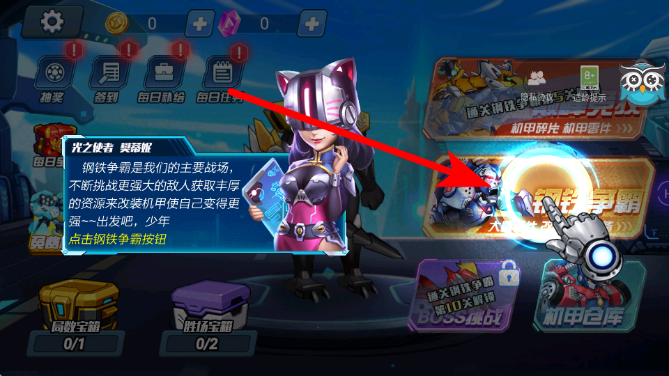 4、完成初步准备后,点击钢铁争霸按钮,进入主要战场,不断挑战更强大的敌人,获取丰厚资源,用这些资源改装机甲,让自身变得更强。
