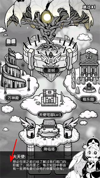 1、进入游戏剧情引导界面后,跟随大天使的剧情介绍了解霉运死劫世界观设定,这是熟悉游戏背景的关键步骤,需耐心阅读剧情文本。