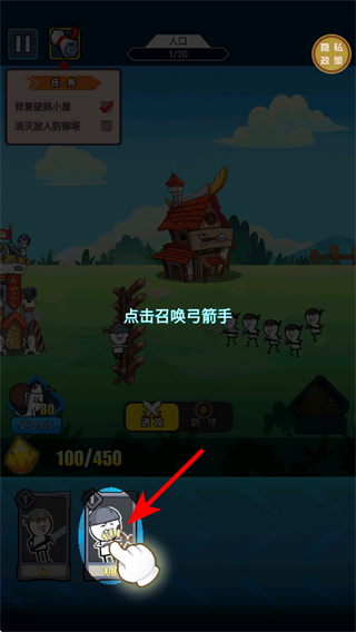 2、依照箭头指引,点击界面下方的弓箭手卡片,召唤该单位,积累兵力以准备后续战斗。