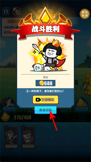 4、战斗胜利后,点击普通领取按钮,可获取对应的奖励资源,用于兵力召唤或建筑升级。