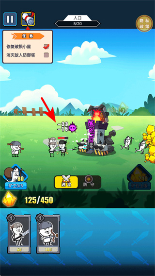 核心玩法围绕挖矿养兵、布阵攻防展开,目标是摧毁敌方防御塔取得胜利,操作逻辑简单清晰,新手也能快速掌握核心策略操作要领。