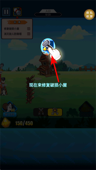 1、点击破损小屋上方的修复道具,可完成修复破损小屋的任务,推进建筑的恢复的进度。