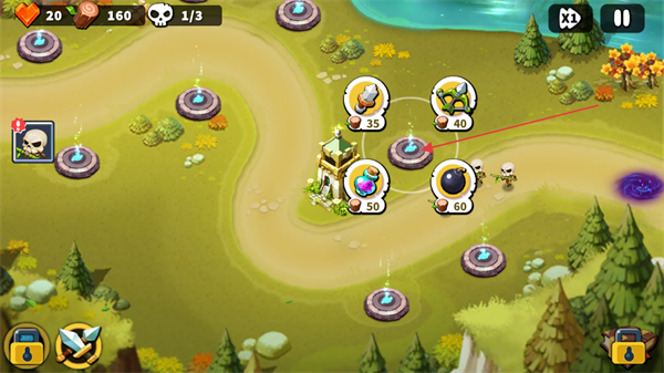 2、在蓝色据点上可以搭建四种不同的防御塔,分别为箭塔、魔法塔、炮塔、士兵塔。