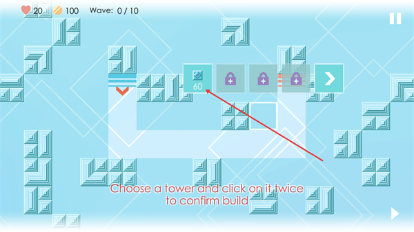 1、进入关卡后,选择界面中显示需要花费60钻石的防御塔选项,按照提示点击该塔两次,即可完成防御塔的建造,为抵御敌人波次做准备。
